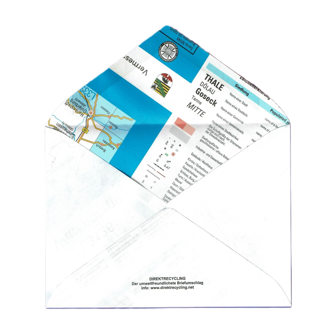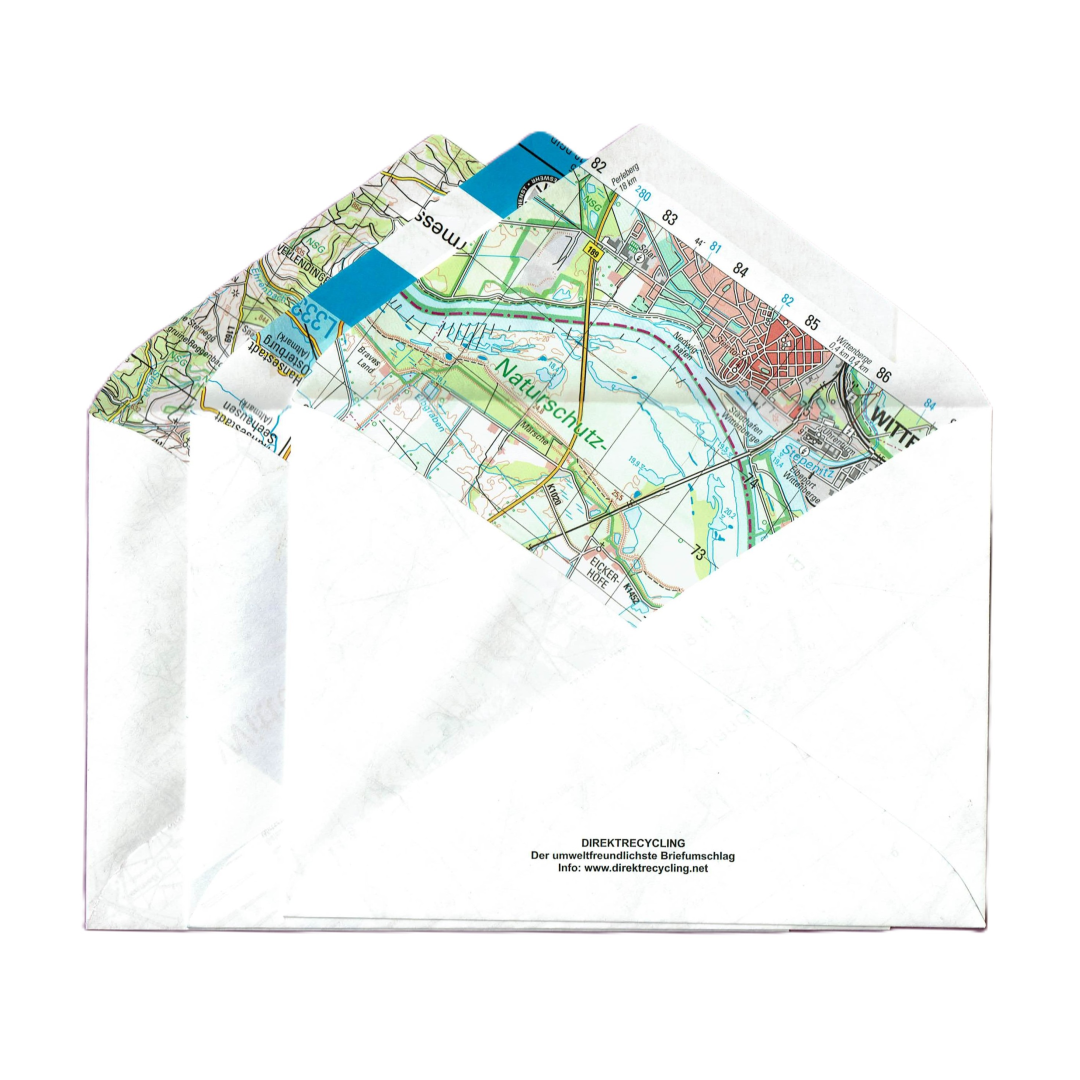 Reuse, reduce, recycle! These unique envelopes made from real outdated German maps make a great souvenir and can be endlessly reused in craft projects, DIY, postcard decorating, junk or bullet journal etc. Produced with love in Gemany. Wet-adhesive, map inside. Packaged pro 15 in cellophane bags.