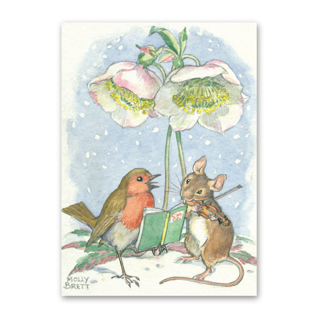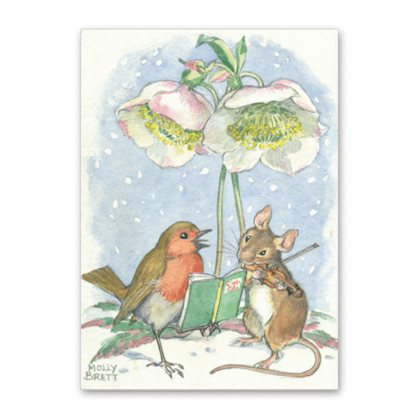 Molly Brett (1902–1990) an English illustrator and writer of children’s literature. The enchanting scenes she created feature delicately drawn details and subtle colours. Her forest dwellers play, celebrate, and make music. They buy presents, take them to the post office, and of course decorate the tree. Magical Christmas greetings with British charm!
