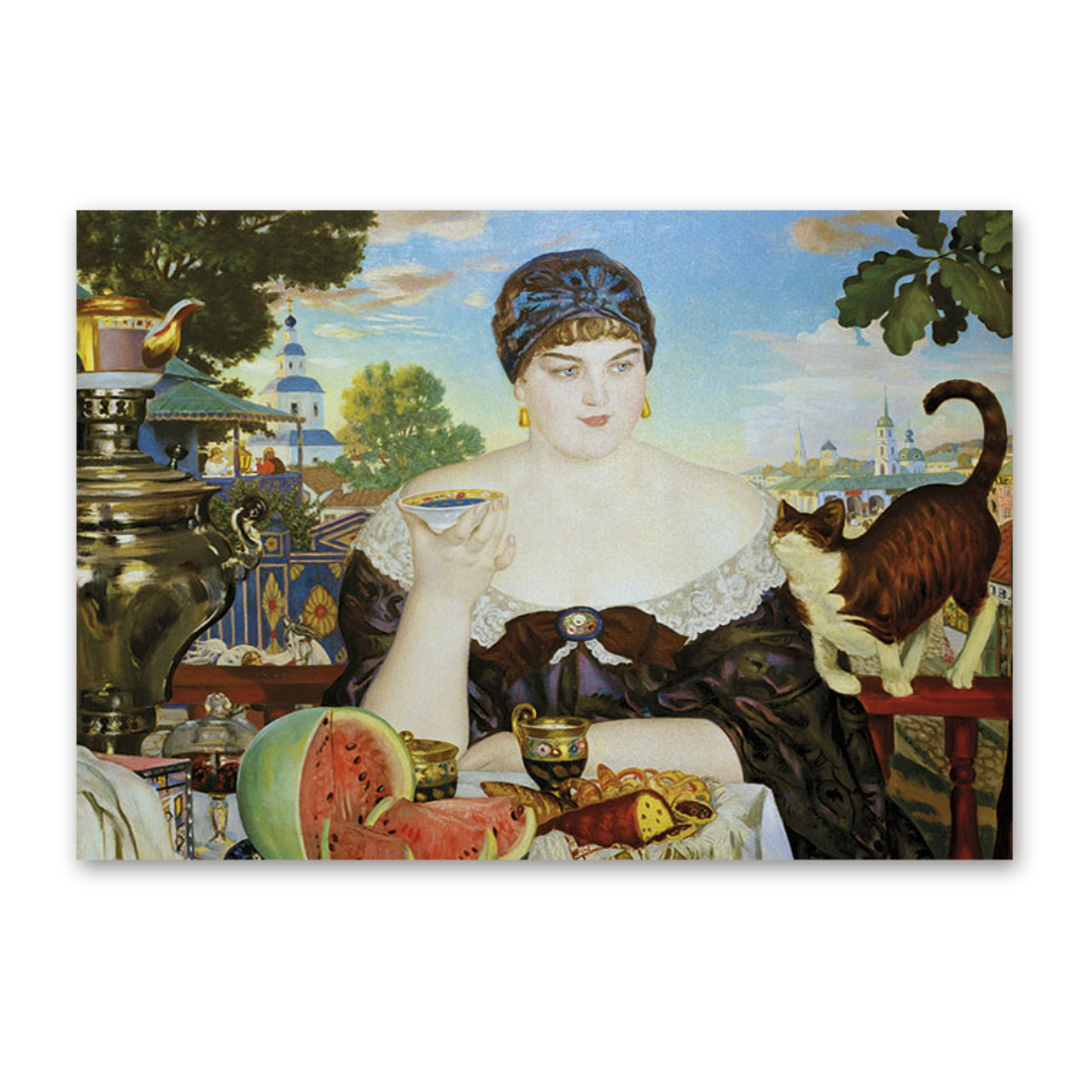 Postcard Kaufmannsfrau beim Tee, Boris Kustodijew